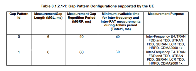 LTE Measurement Gap 是用以量測周圍基地台的訊號強度,藉以決定是否進行換手 (handover) 的基地台選擇。對於在相同頻帶 (intra-band) 一樣是LTE的訊號,只需要切換時間就可以進行量測,對於跨頻帶 (inter-band) 或是跨通訊系統 (inter-RAN) 的訊號量測,就需要 UE 硬體電路對於相對應的中心頻率 (center frequency)、頻寬 (bandwidth) 等硬體參數進行設置。