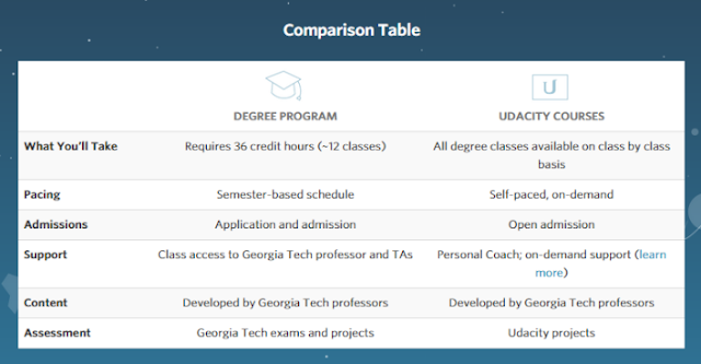 在Udacity上,該學位向所有學生開放,但是前提是這些學生必須通過喬治亞理工學院的申請。申請時,學生需要提供資工相關領域的學士畢業證明與成績單、英文托福認證,以及讀書計畫與自傳等資料。錄取後,每學期必須繳交學分費和雜費,並修習至少三學分的課程,同時,必須在6年內,完成36個學分取得畢業資格。